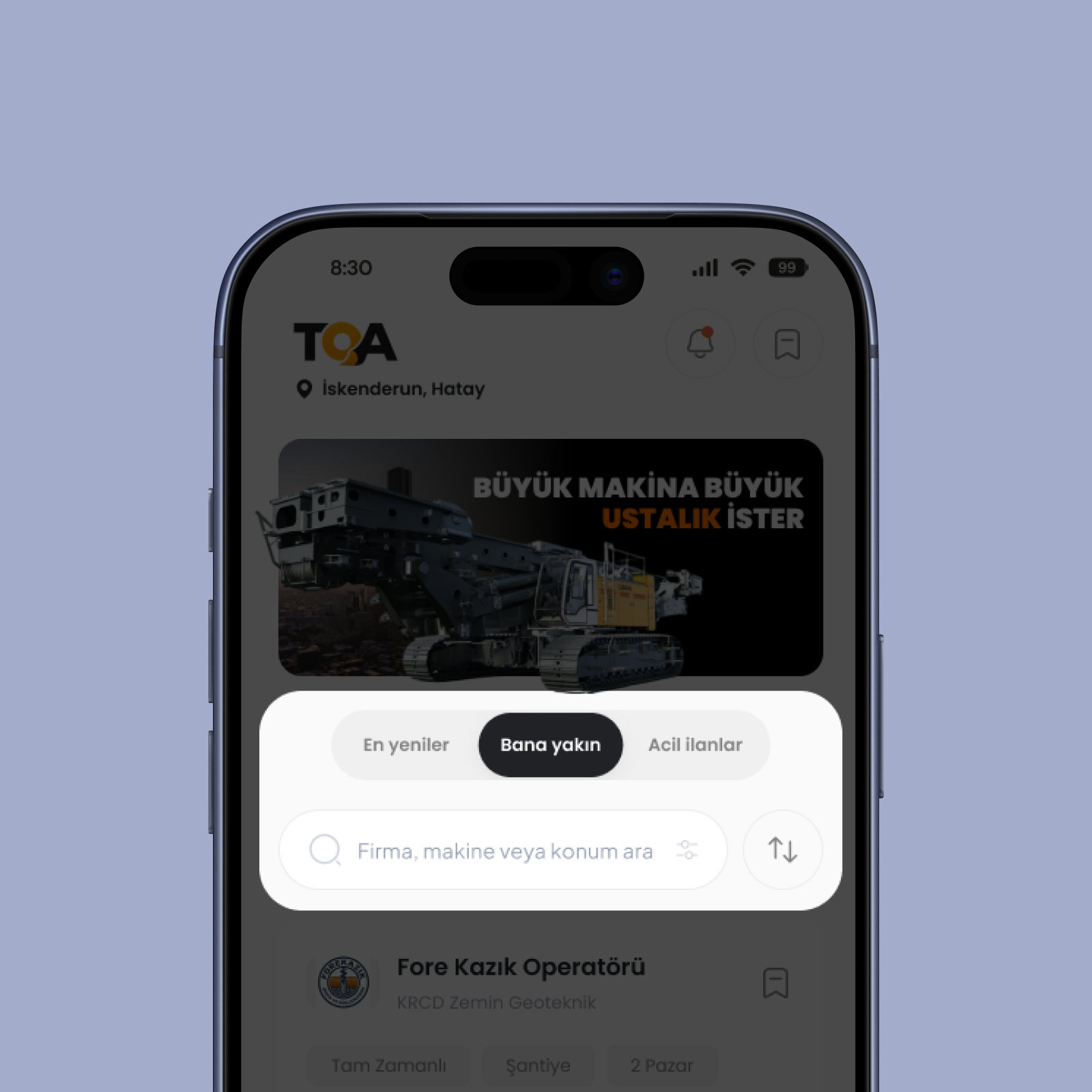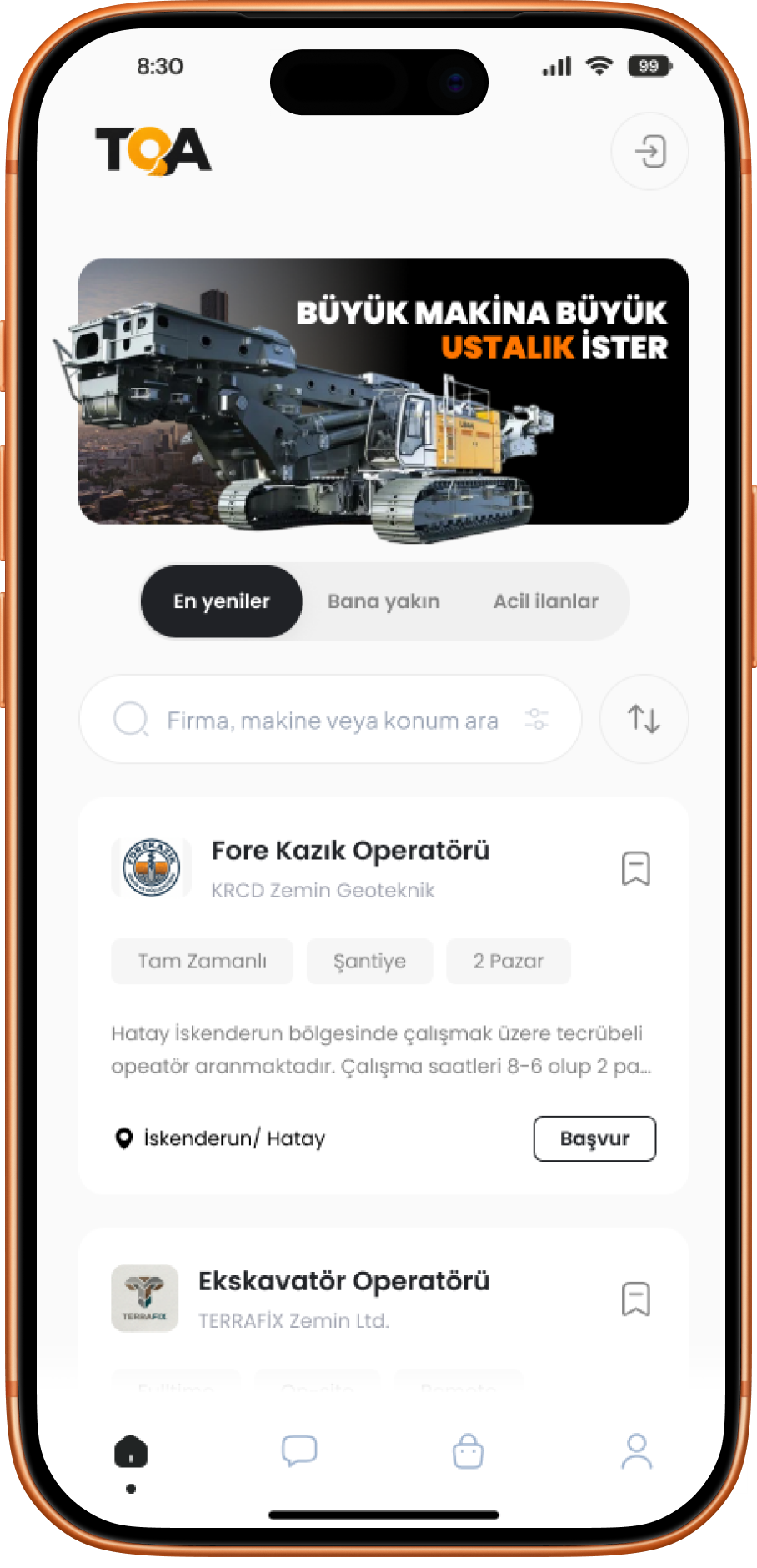 Acil gelişen ekskavatör operatörü ihtiyacımızda haftalarca personel aramak yerine TOA üzerinden ilan açtık. Sadece birkaç saat içinde belgeleri doğrulanmış, tecrübeli bir operatörle anlaşıp işi aksatmadan devam ettik. Şantiyemizin en büyük dijital destekçisi.